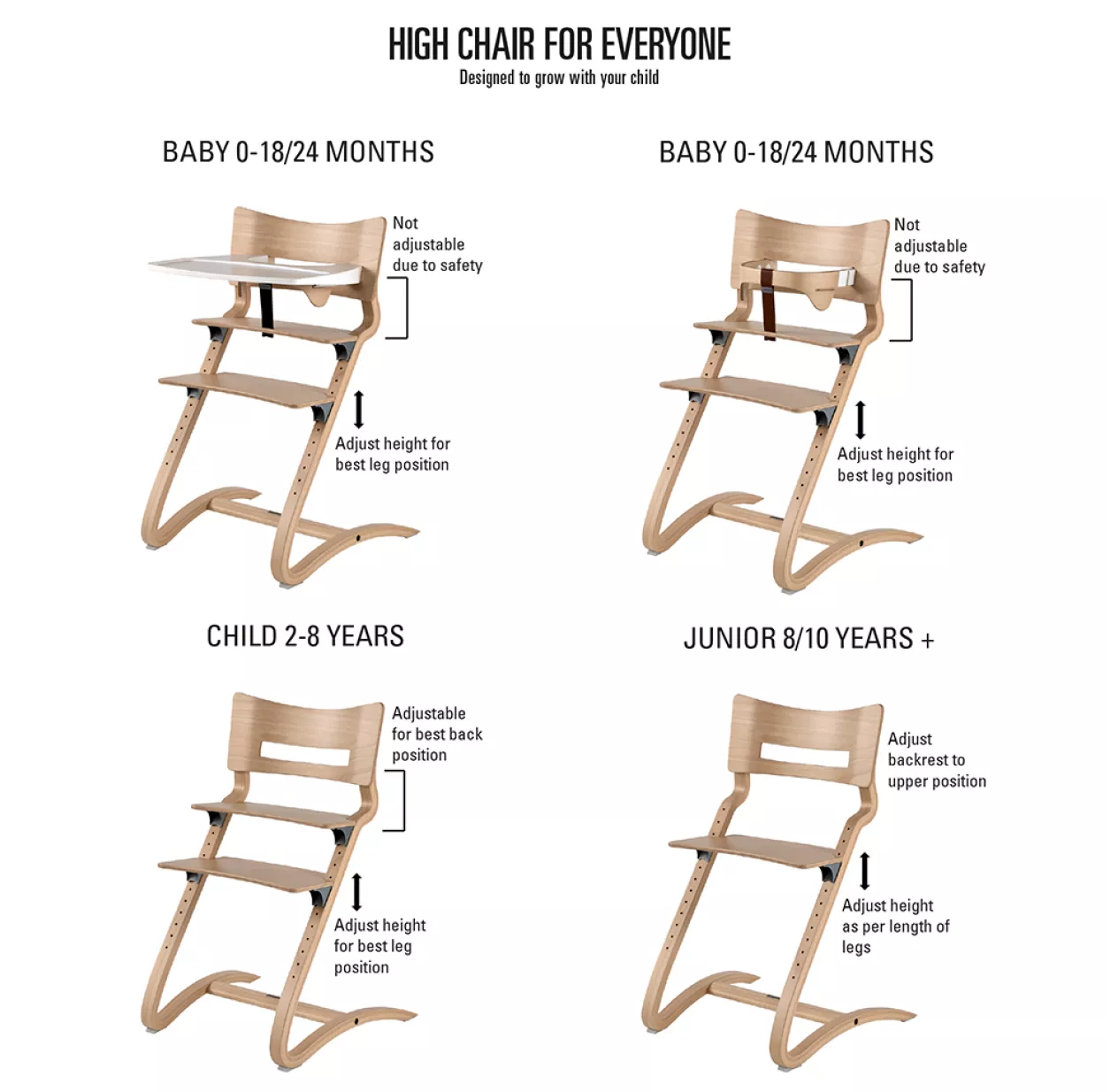 La chaise évolutive Leander accompagne votre bébé de 5-6 mois jusqu’à l’âge adulte. Son assise ainsi que son repose-pieds s’ajustent à la taille de l’enfant au fur et à mesure qu’il grandit pour lui permettre de partager la table de ses parents dès son plus jeune âge. Comme tout le mobilier enfant designé par Stig Leander Nielsen, la chaise haute évolutive Leander est le fruit d’une analyse poussée des besoins de l’enfant, c’est aussi un produit durable qui trouvera sa place dans une chambre d’enfant comme chaise de bureau par exemple.