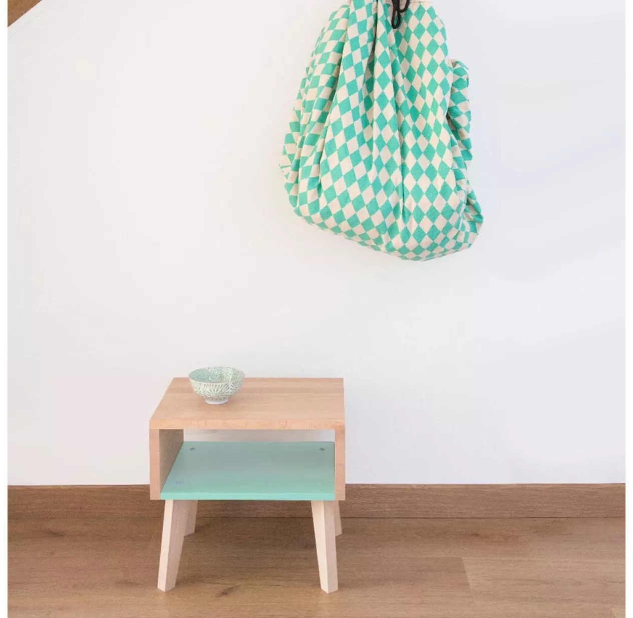 Chevet ou bout de canapé en hêtre. Son style design et retro à la fois conviendra dans tous les intérieurs. Plateau supérieur verni avec un vernis à l’eau ecolabel très résistant. Le plateau du casier coloré est en contreplaqué de bouleau peint.