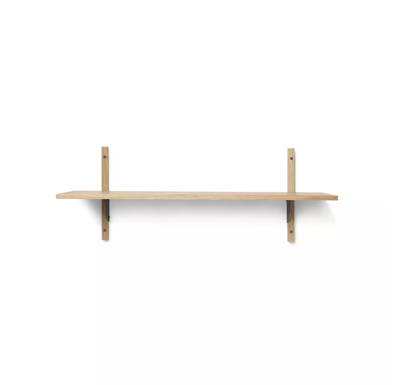 Le système modulaire Sector revisite l’étagère murale du milieu du siècle dans une version moderne et fonctionnelle. L’étagère Sector affirme une simplicité robuste dans un esprit naturel et minimaliste. Dans cette version Large et simple, l’étagère Sector associe placage de chêne naturel et laiton noirci. Elle est aussi disponible en placage de frêne teinté noir et ses supports en laiton noirci existent également en laiton poli. L’étagère Simple Large Sector de Ferm Living se fixe au mur avec des montants en bois massif et des vis apparentes. Elle est idéale pour mettre en scène vos objets préférés dans une chambre enfant, un salon, des plantes ou des pots de rangement dans une cuisine. Elle s’associe parfaitement au bureau mural Sector qui se décline dans les mêmes couleurs et finitions.