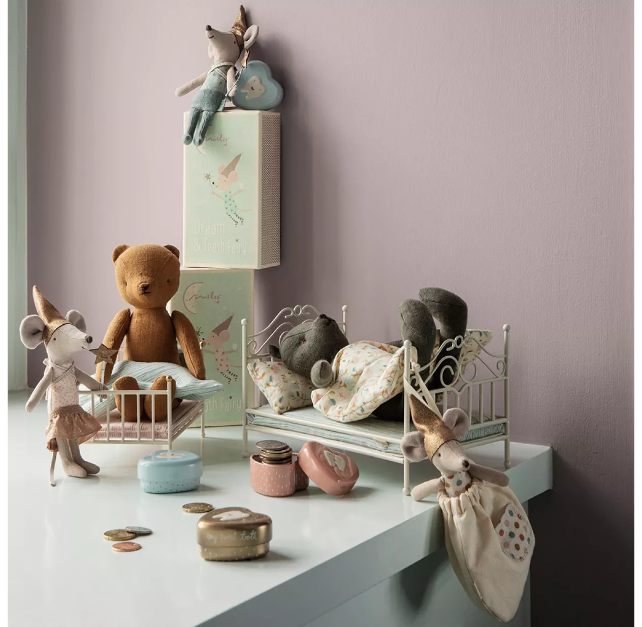Cet adorable lit vintage en métal écru a été créé pour le confort des souris Maileg ! Il s’associe à tout le mobilier et les accessoires pour maison de souris Maileg. Un design vintage tout en finesse, le lit Maileg anthracite est livré avec une parure de lit complète: oreille, matelas et couette dans des imprimés délicatement désuets qui lui donne un parfum d’antan. Ce lit a été conçu pour accueillir les souris Maileg quelle que soit leur taille dans les versions Baby, Little et Big.
